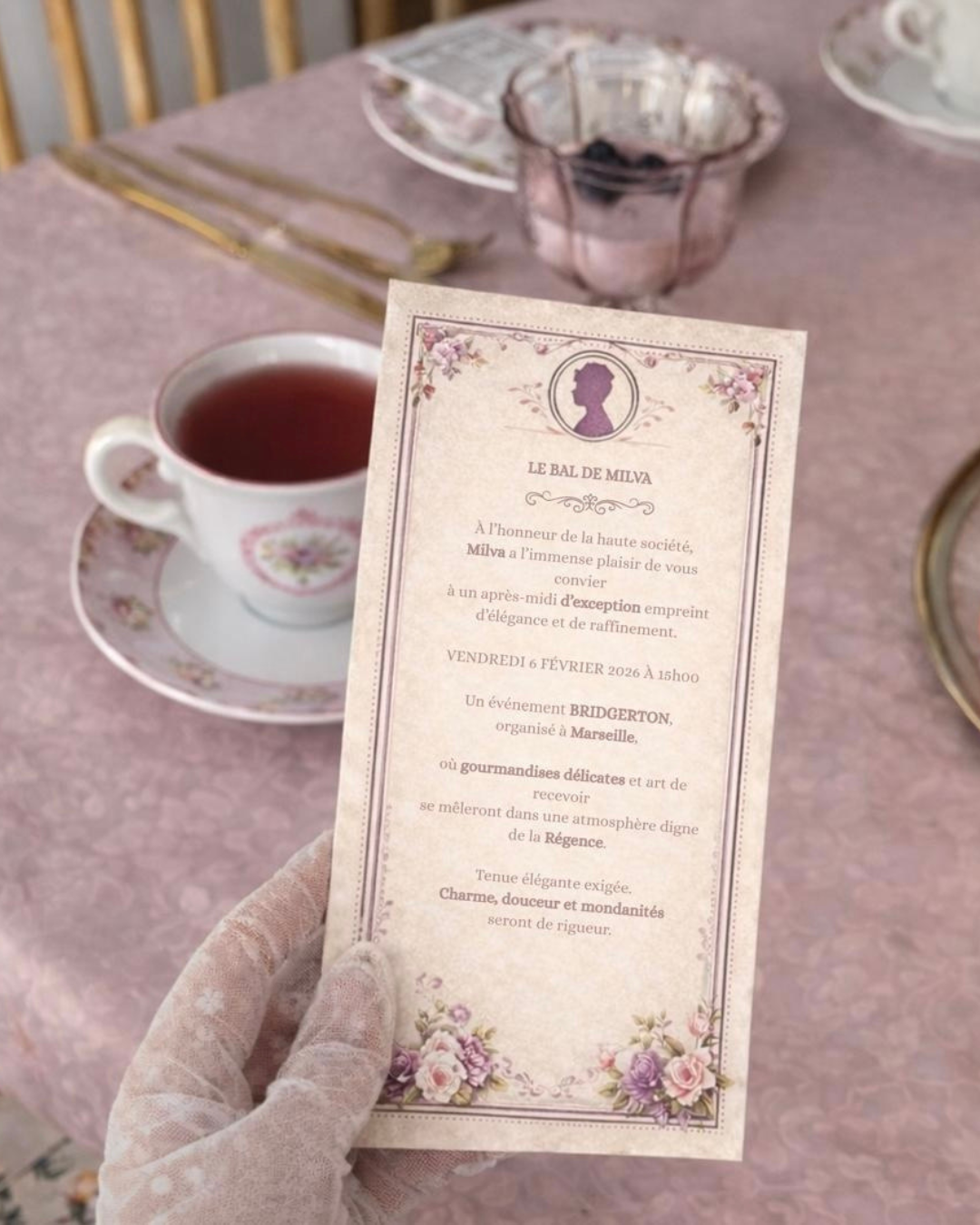 Le Bal de Milva est une expérience intimiste et immersive, inspirée de l’univers Bridgerton : une parenthèse romantique, poudrée et élégante au cœur de Marseille.